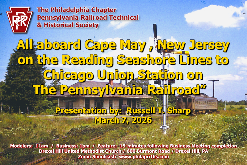 Feature Presentation ("All Aboard Cape May, NJ on the Reading Seashore Lines to Chicago Union Station on the Pennsylvania Railroad) Russell T. Sharp, former Pennsylvania Railroad Chainman and Drexel Institute of Technology student presented. Russell displayed and discussed photos taken in the 1960s on the Pennsylvania-Reading Seashore Lines and the Pennsylvania Railroad. Includes locomotives, roundhouses, trains and many other things that you don’t see anymore.